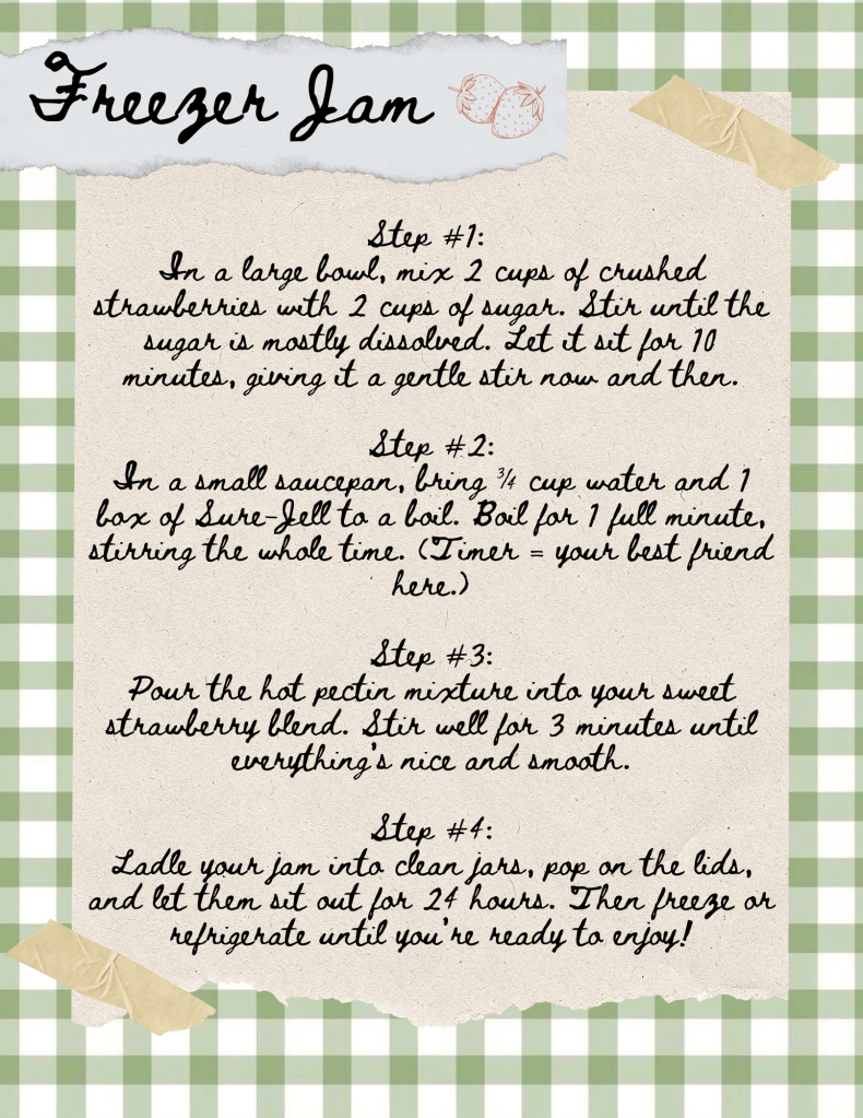 Summer is when the strawberries are ripe—and in my family, that means it’s jam season. Every June, we make a batch of freezer jam, and it’s one of those little traditions I look forward to all year. It’s something I hope to carry with me into adulthood, and this time, I thought I’d share it with you too.